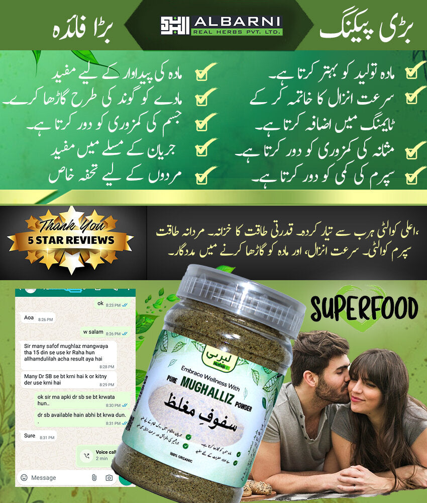 Boost your sperm count, volume, and stamina with Safoof e Mugaliz, a premium natural powder formulated with 18 proven and authentic herbs. These carefully selected ingredients have been used for centuries to support men's reproductive health.